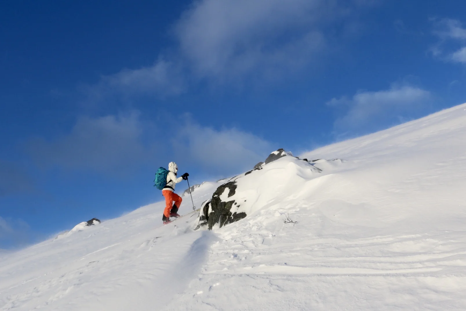 Søndag våknet jeg til oppholdsvær og sol i siktet. Så det var bare å pakke sekken og komme seg ut på tur igjen. Det blåste en del i natt, men jeg håpet på at en del av den fine snøen som har kommet den siste tiden hadde fått lagt i fred.