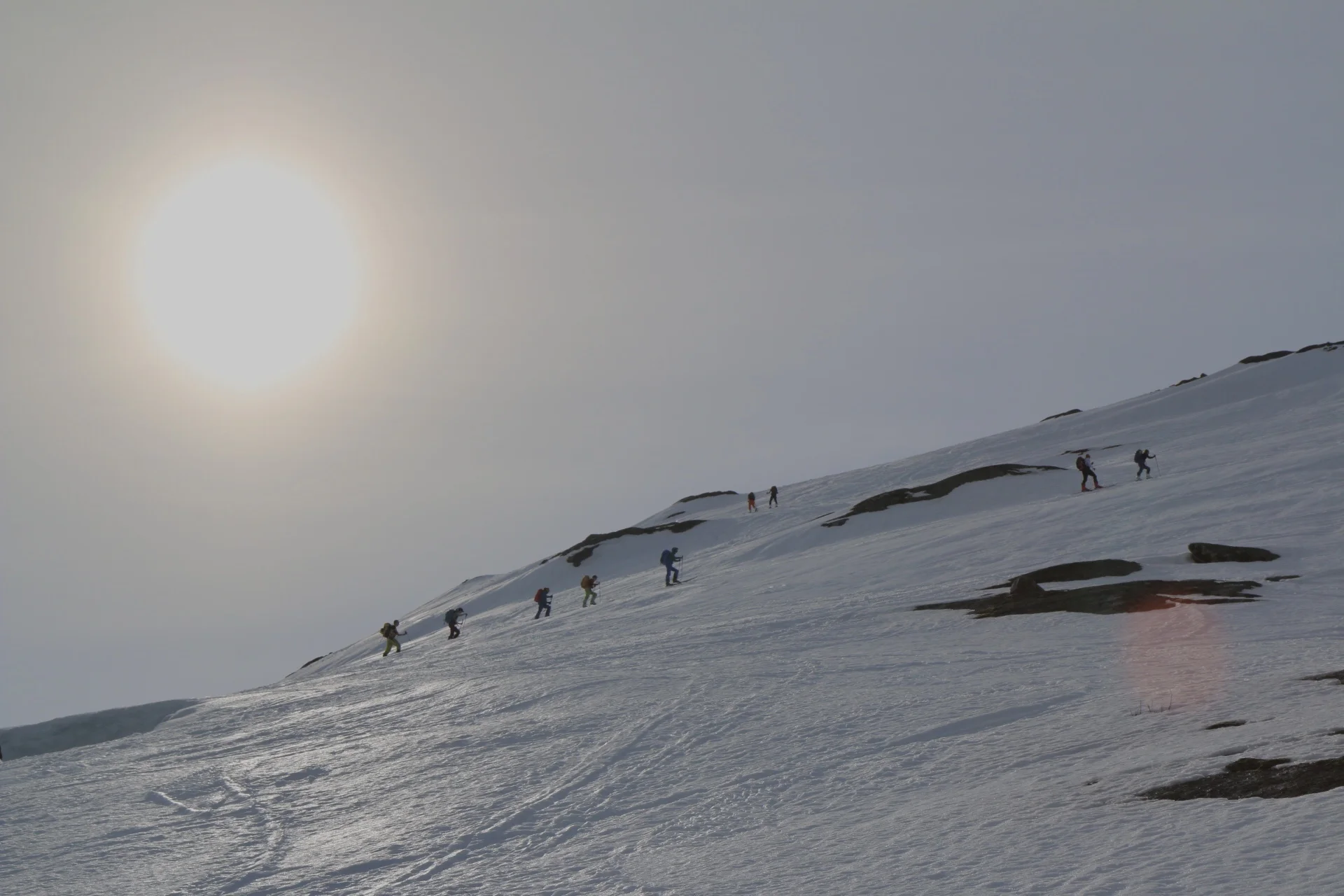 Snøen endret seg fra å være skarete med litt gjennomslag, til å bli skare uten gjennomslag, men været var helt upåklagelig med sol og helt vindstille. Heldigvis 🙏