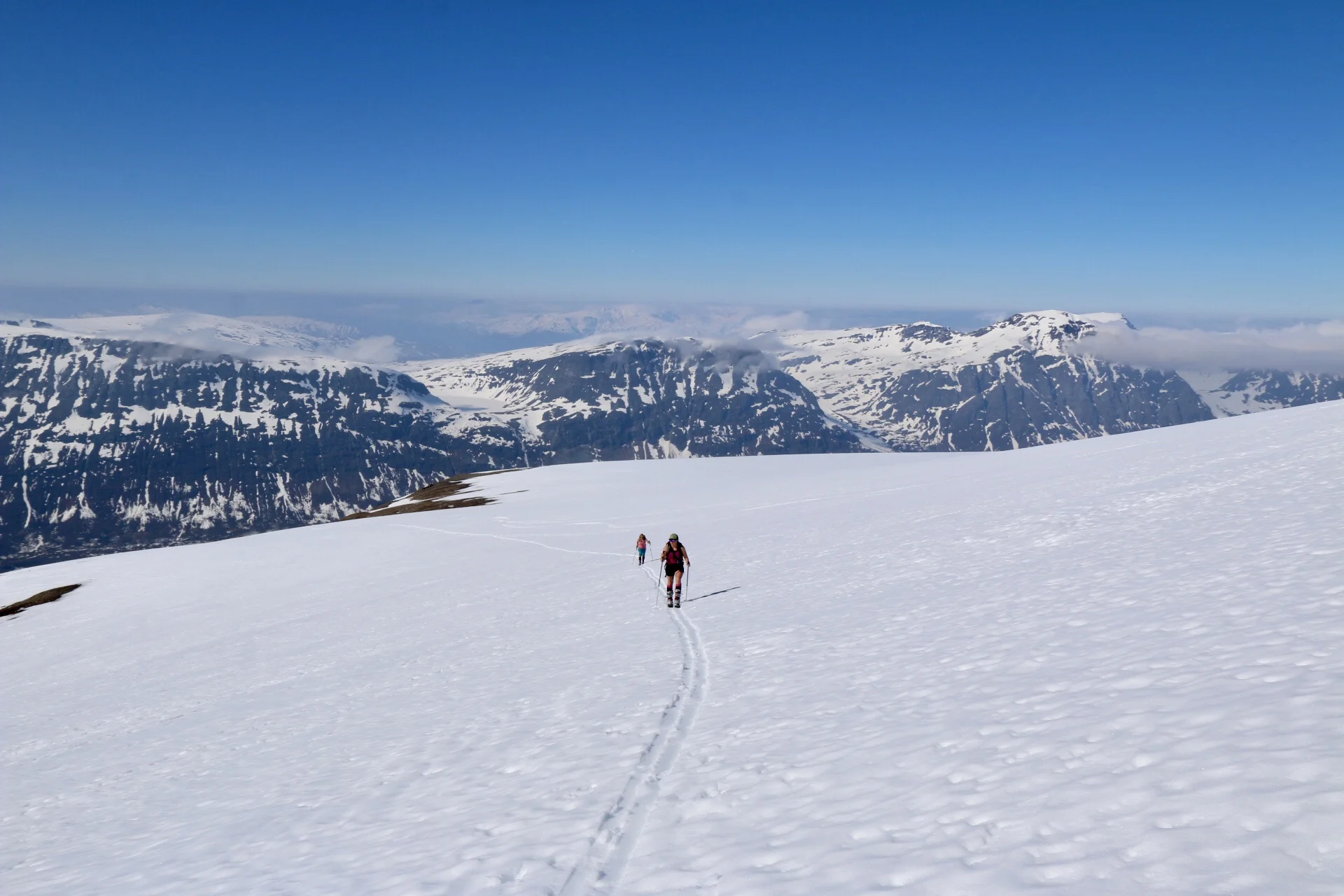På denne tiden av skisesongen lurer man jo alltid på hvordan føret blir når man skal ned. Solen gjør ofte sitt til at det blir dårlig glid, men vi ble velsignet med «verdensmesterføre» hele veien ned. Det var ikke «lugging» før vi kom til skogen, men da var vi så fornøyde at det spilte liten rolle. Vi utløste en del saktegående slushskred, men det var aldri noen fare.